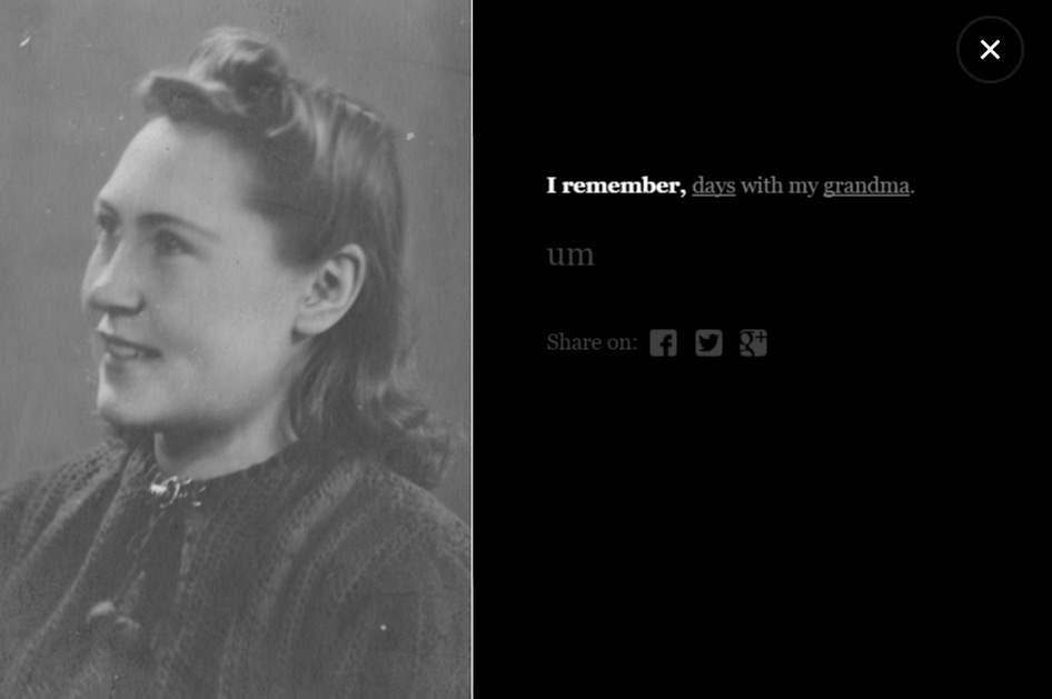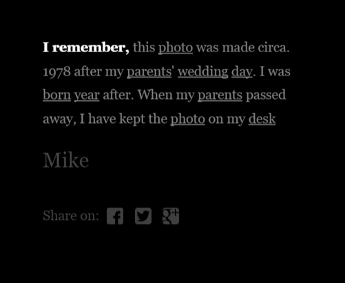 Particles are the main graphical part of the website, so we brought a careful consideration about them. A second part of post-processing have been added with an RGB Shift, Tilt Shift, Noise, Color ajustments... We also collaborated with the Xerox reserch center (Grenoble) to automatically tag all the memories from his direct content and link the memories by several main words.